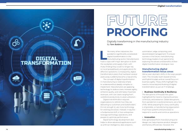 Rapid technology development also helps to drive advanced applications such as artificial intelligence , data analytics , automation , edge computing , and decentralized management . To ensure success in the future , manufacturing technology leaders must spend time exploring the drivers and benefits of their digital transformation strategies now .