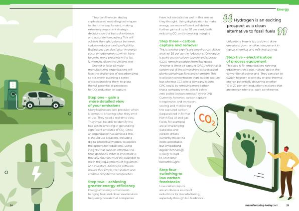 This is another significant step that can deliver another 20 per cent in reductions . One option is point-source carbon capture and storage ( CCS ), removing carbon from flue gases . Another is direct air capture ( DAC ), which takes carbon out of the atmosphere at specialized plants using huge fans and chemistry . This is at lower concentration than carbon capture , but whereas CCS take a company to zero , DAC could , by removing more carbon that a company emits , take it below zero ( called ‘ carbon removal ’ by the UN ). Currently , however , carbon capture is expensive , and transport , storing and monitoring the captured carbon ( sequestered in former North Sea oil and gas fields , for example ) are all challenging . Subsidies and carbon offsets currently make the costs acceptable , but embedding digital technology is likely to lead to economic breakthroughs .