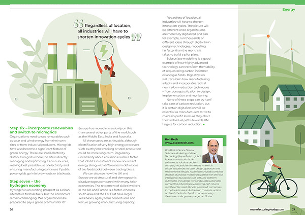 Ron Beck is Senior Director , Solutions Marketing at Aspen Technology ( AspenTech ) a global leader in asset optimization software . Its solutions address complex , industrial environments where it is critical to optimize the asset design , operation and maintenance lifecycle . AspenTech uniquely combines decades of process modelling expertise with artificial intelligence . Its purpose-built software platform automates knowledge work and builds sustainable competitive advantage by delivering high returns over the entire asset lifecycle . As a result , companies in capital-intensive industries can maximize uptime and push the limits of performance , running their assets safer , greener , longer and faster . manufacturing-today . com 27
