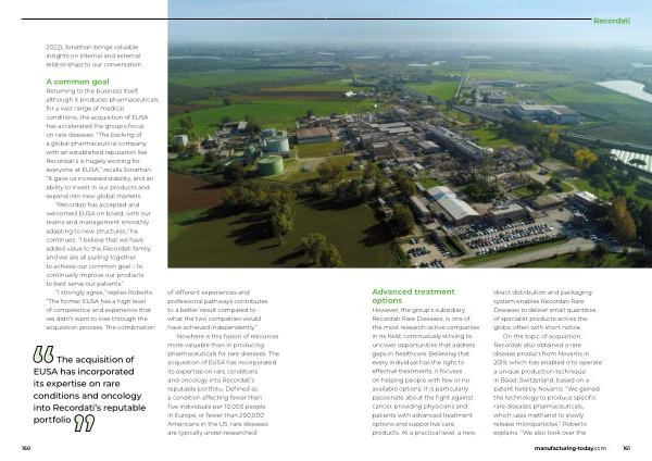 On the topic of acquisition , Recordati also obtained a rare disease product from Novartis in 2019 , which has enabled it to operate a unique production technique in Basel , Switzerland , based on a patent held by Novartis . “ We gained the technology to produce specific rare diseases pharmaceuticals , which uses methanol to slowly release microparticles ,” Roberto explains . “ We also took over the