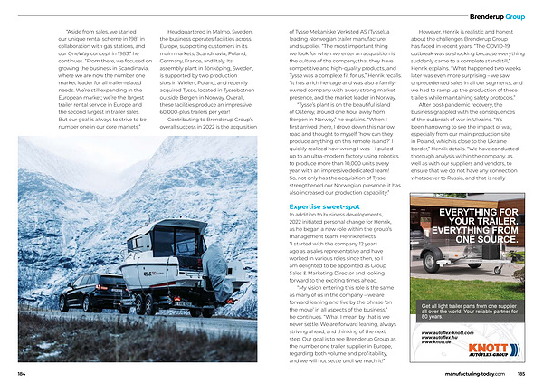 “ My vision entering this role is the same as many of us in the company – we are forward leaning and live by the phrase ‘ on the move ’ in all aspects of the business ,” he continues . “ What I mean by that is we never settle . We are forward leaning , always striving ahead , and thinking of the next step . Our goal is to see Brenderup Group as the number one trailer supplier in Europe , regarding both volume and profitability , and we will not settle until we reach it !” manufacturing-today . com 185