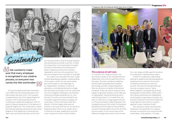 FO was founded as Northern Aromatics Ltd in 1967 and has remained based in the Manchester area ever since . The company is supported by one of the largest fragrance houses in the world and prides itself on combining a collaborative approach with its years of industry experience in the delivery of bespoke fragrances . The six key areas in which the business operates are personal care , home fragrance , fine fragrances , household care ,