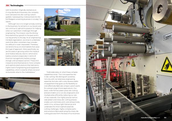 Todd elaborates on what these complex capabilities entail . “ Our core expertise lies in die-cutting . We distinguish ourselves , not only with our extensive engineering expertise , but also with a very diverse stable of equipment that gives us the flexibility to cost-effectively fabricate unique custom parts for a broad range of end applications . Our basic , wide-format platen press die-cutting presses enable us to cut very large parts and multiple plies efficiently , reducing our use of raw materials . Our highly precise narrowweb platen and rotary die-cutting presses enable us to laminate , print , and ultrasonically weld in-line , achieve tight tolerances and undertake the most sophisticated diecutting challenges . Highly complex parts and solutions fabricated using the rotary die cutting process form the base of our business .