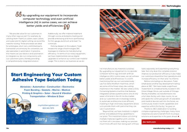 tasks separately and assembling everything later . Not only does this complete solution improve our production efficiency it also helps our customers streamline their operations and increase efficiency on their end ,” he informs . Before concluding our discussion , Todd emphasizes another key development taking place at JBC . “ We have made a significant investment in a medical facility located in Elk Grove Village , Illinois , just outside of Chicago . Shortly thereafter , we transformed it into a full clean facility with clean rooms . As we anticipate the continued growth of wearables and medical devices well into the future , we continuously invest in both capabilities and expertise within this facility ,” he goes on .