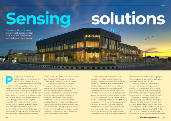 Solely focused on the production of current and voltage sensing components and solutions LEM boasts an impressive production output , as quantified by Uwe : “ Across the wide scope of applications for our products , we produce a total of nearly 100 million sensors per year with each application requiring different production volumes . For example , within the traction industry , specifically for railway businesses and companies conducting test benches , we are producing and delivering just 50-to-60 units of highly complex sensors per year . On the other hand , we also have medium-volume