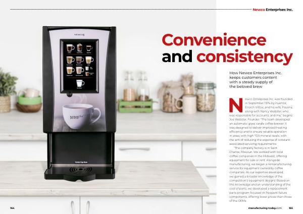 “ The company factory is in Saint Charles , Missouri . We worked with local coffee companies in the Midwest , offering equipment for sale or rent . Alongside manufacturing , we began a remanufacturing service for equipment owned by coffee companies . As our expertise developed , we gained a broader knowledge of the competition ’ s equipment designs . Based on this knowledge and an understanding of the cost of parts , we developed a replacement parts program focused on frequent failure components , offering lower prices than those of the OEMs . manufacturing-today . com 165