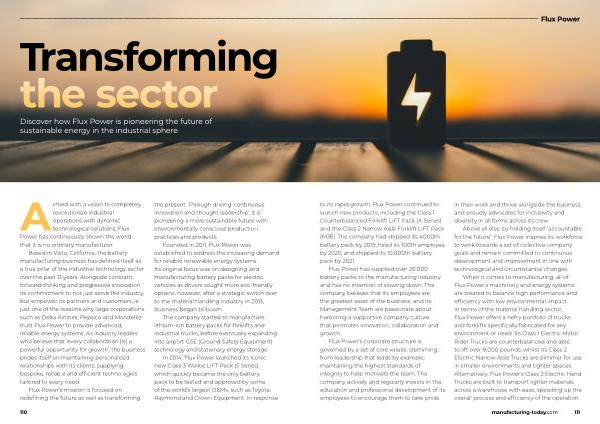 When it comes to manufacturing , all of Flux Power ’ s machinery and energy systems are created to balance high performance and efficiency with low environmental impact . In terms of the material handling sector , Flux Power offers a hefty portfolio of trucks and forklifts specifically fabricated for any environment or need . Its Class 1 Electric Motor Rider Trucks are counterbalanced and able to lift over 8,000 pounds , whilst its Class 2 Electric Narrow Aisle Trucks are slimmer for use in smaller environments and tighter spaces . Alternatively , Flux Power ’ s Class 3 Electric Hand Trucks are built to transport lighter materials across a warehouse with ease , speeding up the overall process and efficiency of the operation .