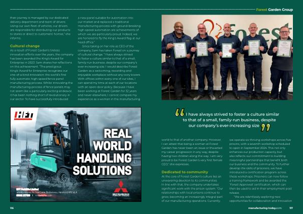 As a result of Forest Garden ’ s tireless innovation efforts over the years , the company has been awarded the King ’ s Award for Enterprise in 2023 . Sam shares her reflections on this achievement . “ The prestigious King ’ s Award for Enterprise recognizes our one-of-a-kind innovation : the world ’ s first fully automatic high-speed fence panel manufacturing process . Whilst innovating the manufacturing process of fence panels may not seem like a particularly exciting endeavor , it has been nothing short of revolutionary in our sector . To have successfully introduced