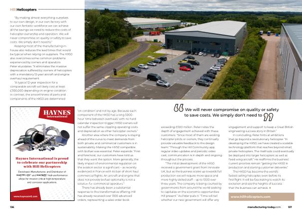 Keeping most of the manufacturing inhouse also reduces the lead times that would be typical when relying on suppliers . The HX50 also overcomes some common problems experienced by owners and operators . Peter elucidates : “ It eliminates the massive depreciation suffered by owners of helicopters with a mandatory 12-year aircraft and engine overhaul requirement .