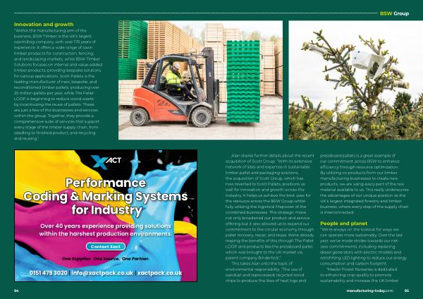 Alan shares further details about the recent acquisition of Scott Group : “ With its extensive network of sites and expertise in sustainable timber pallet and packaging solutions , the acquisition of Scott Group , which has now reverted to Scott Pallets , positions us well for innovation and growth across the industry . It helps us achieve the best uses for the resource across the BSW Group whilst fully utilizing the logistical firepower of the combined businesses . This strategic move not only broadened our product and service offering but it also allowed us to expand our commitment to the circular economy through pallet recovery , repair , and reuse . We ’ re already reaping the benefits of this through The Pallet LOOP and products like the pressboard pallet , which was brought to the UK market via parent company Binderholz .”