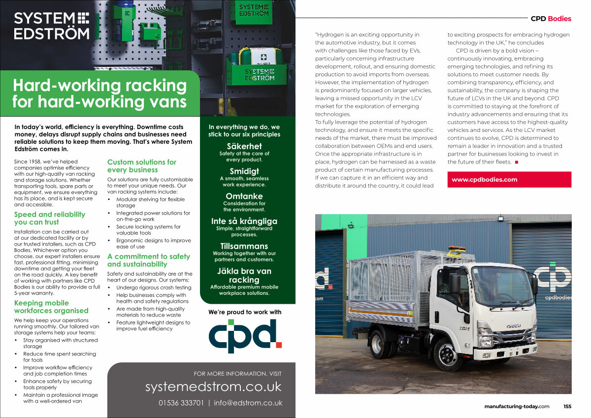 “ Hydrogen is an exciting opportunity in the automotive industry, but it comes with challenges like those faced by EVs, particularly concerning infrastructure development, rollout, and ensuring domestic production to avoid imports from overseas. However, the implementation of hydrogen is predominantly focused on larger vehicles, leaving a missed opportunity in the LCV market for the exploration of emerging technologies. To fully leverage the potential of hydrogen technology, and ensure it meets the specific needs of the market, there must be improved collaboration between OEMs and end users. Once the appropriate infrastructure is in place, hydrogen can be harnessed as a waste product of certain manufacturing processes. If we can capture it in an efficient way and distribute it around the country, it could lead to exciting prospects for embracing hydrogen technology in the UK,” he concludes CPD is driven by a bold vision – continuously innovating, embracing emerging technologies, and refining its solutions to meet customer needs. By combining transparency, efficiency, and sustainability, the company is shaping the future of LCVs in the UK and beyond. CPD is committed to staying at the forefront of industry advancements and ensuring that its customers have access to the highest-quality vehicles and services. As the LCV market continues to evolve, CPD is determined to remain a leader in innovation and a trusted partner for businesses looking to invest in the future of their fleets. ■