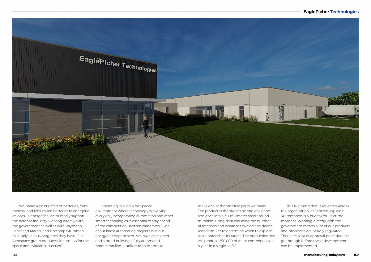 Technologies make one of the smallest parts we make. The product is the size of the end of a pencil and goes into a 30-millimeter smart round munition. Using data including the number of rotations and distance traveled, the device uses formulas to determine when to explode as it approaches its target. The production line will produce 250,000 of these components in a year, in a single shift.”