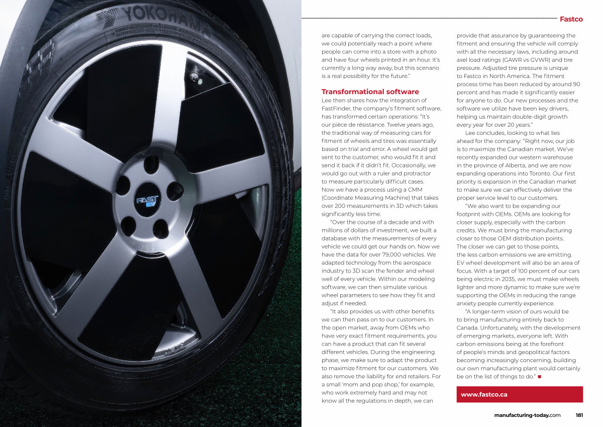Lee then shares how the integration of FastFinder, the company’ s fitment software, has transformed certain operations:“ It’ s our pièce de résistance. Twelve years ago, the traditional way of measuring cars for fitment of wheels and tires was essentially based on trial and error. A wheel would get sent to the customer, who would fit it and send it back if it didn’ t fit. Occasionally, we would go out with a ruler and protractor to measure particularly difficult cases. Now we have a process using a CMM( Coordinate Measuring Machine) that takes over 200 measurements in 3D which takes significantly less time.