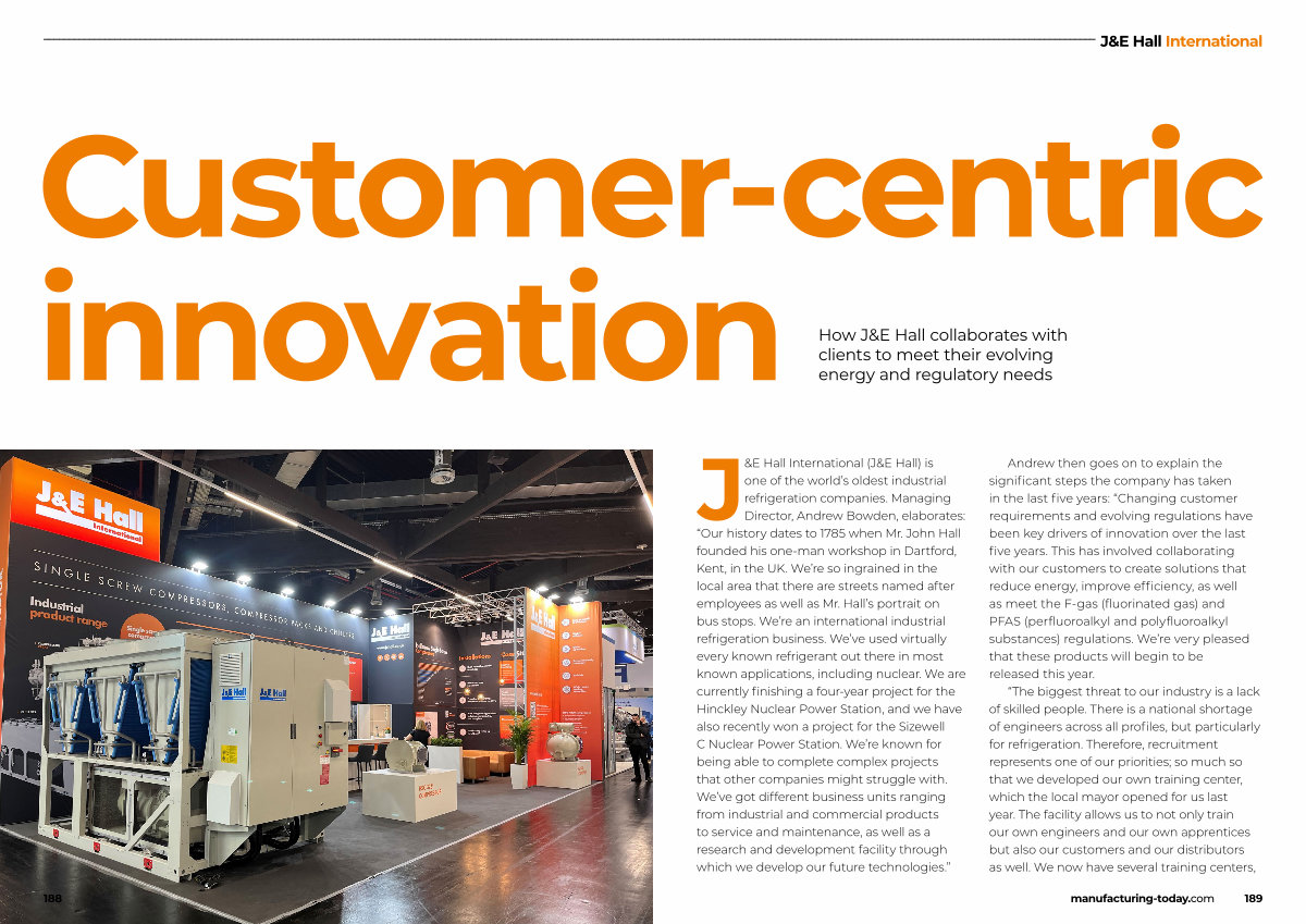 & E Hall International( J & E Hall) is one of the world’ s oldest industrial refrigeration companies. Managing Director, Andrew Bowden, elaborates:“ Our history dates to 1785 when Mr. John Hall founded his one-man workshop in Dartford, Kent, in the UK. We’ re so ingrained in the local area that there are streets named after employees as well as Mr. Hall’ s portrait on bus stops. We’ re an international industrial refrigeration business. We’ ve used virtually every known refrigerant out there in most known applications, including nuclear. We are currently finishing a four-year project for the Hinckley Nuclear Power Station, and we have also recently won a project for the Sizewell C Nuclear Power Station. We’ re known for being able to complete complex projects that other companies might struggle with. We’ ve got different business units ranging from industrial and commercial products to service and maintenance, as well as a research and development facility through which we develop our future technologies.”