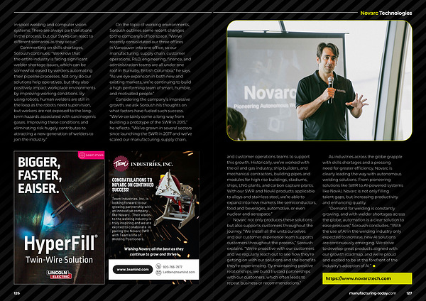 and customer operations teams to support this growth. Historically, we’ ve worked with the oil and gas industry, ship builders, and mechanical contractors, building pipes and modules for high rise buildings, stadiums, ships, LNG plants, and carbon capture plants. With our SWR and NovAI products applicable to alloys and stainless steel, we’ re able to expand into new markets like semiconductors, food and beverages, automotive, or even nuclear and aerospace.”