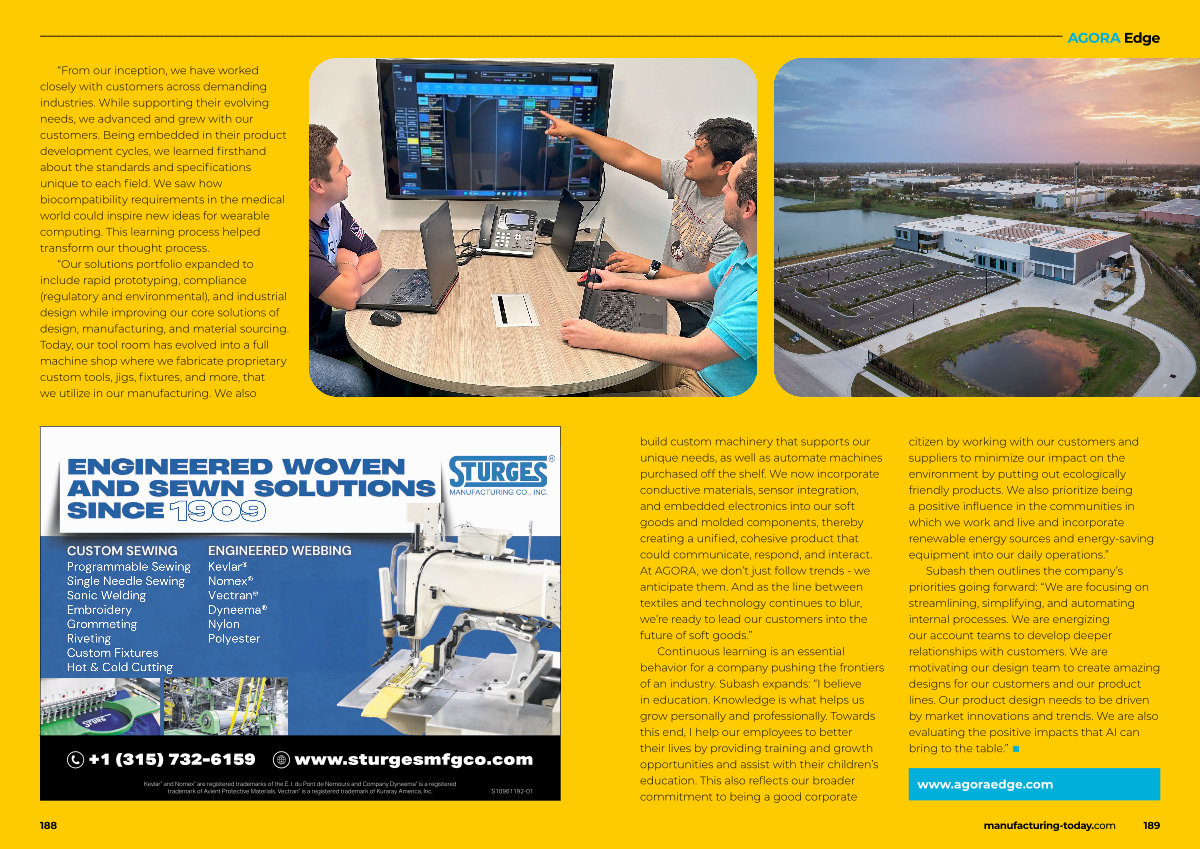 build custom machinery that supports our unique needs, as well as automate machines purchased off the shelf. We now incorporate conductive materials, sensor integration, and embedded electronics into our soft goods and molded components, thereby creating a unified, cohesive product that could communicate, respond, and interact. At AGORA, we don’ t just follow trends- we anticipate them. And as the line between textiles and technology continues to blur, we’ re ready to lead our customers into the future of soft goods.”