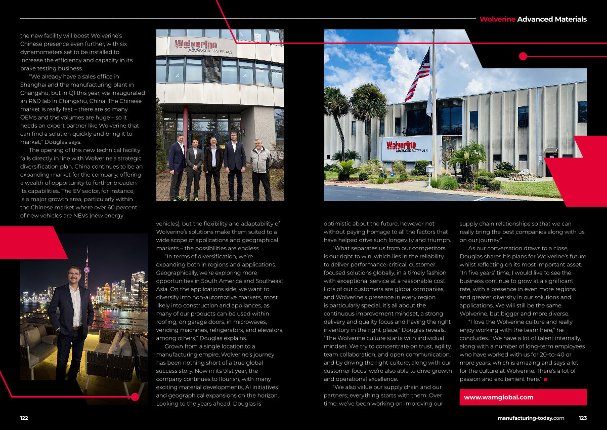 “ We already have a sales office in Shanghai and the manufacturing plant in Changshu, but in Q1 this year, we inaugurated an R & D lab in Changshu, China. The Chinese market is really fast – there are so many OEMs and the volumes are huge – so it needs an expert partner like Wolverine that can find a solution quickly and bring it to market,” Douglas says.