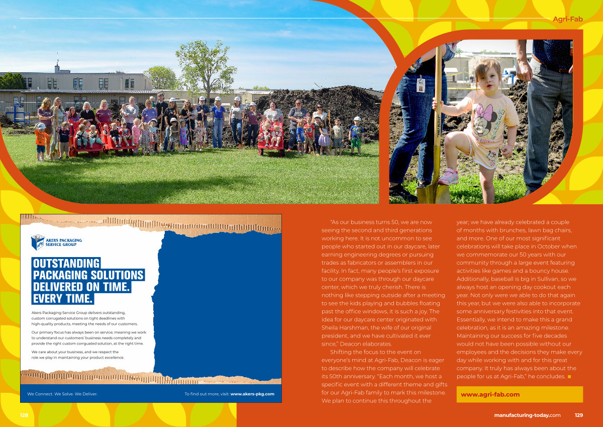 year; we have already celebrated a couple of months with brunches, lawn bag chairs, and more. One of our most significant celebrations will take place in October when we commemorate our 50 years with our community through a large event featuring activities like games and a bouncy house. Additionally, baseball is big in Sullivan, so we always host an opening day cookout each year. Not only were we able to do that again this year, but we were also able to incorporate some anniversary festivities into that event. Essentially, we intend to make this a grand celebration, as it is an amazing milestone. Maintaining our success for five decades would not have been possible without our employees and the decisions they make every day while working with and for this great company. It truly has always been about the people for us at Agri-Fab,” he concludes. ■