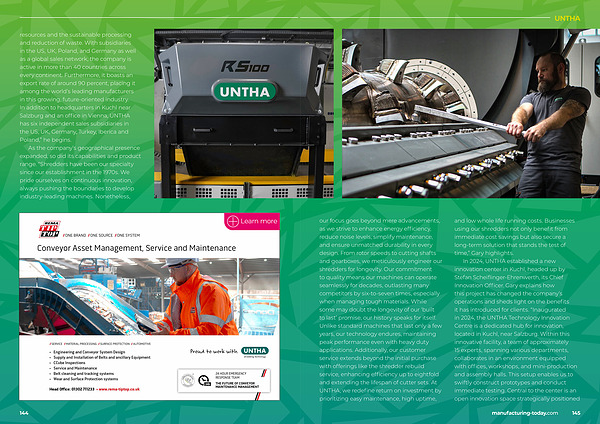 In 2024, UNTHA established a new innovation center in Kuchl, headed up by Stefan Scheiflinger-Ehrenwerth, its Chief Innovation Officer. Gary explains how this project has changed the company’ s operations and sheds light on the benefits it has introduced for clients.“ Inaugurated in 2024, the UNTHA Technology Innovation Centre is a dedicated hub for innovation, located in Kuchl, near Salzburg. Within this innovative facility, a team of approximately 15 experts, spanning various departments, collaborates in an environment equipped with offices, workshops, and mini-production and assembly halls. This setup enables us to swiftly construct prototypes and conduct immediate testing. Central to the center is an open innovation space strategically positioned
