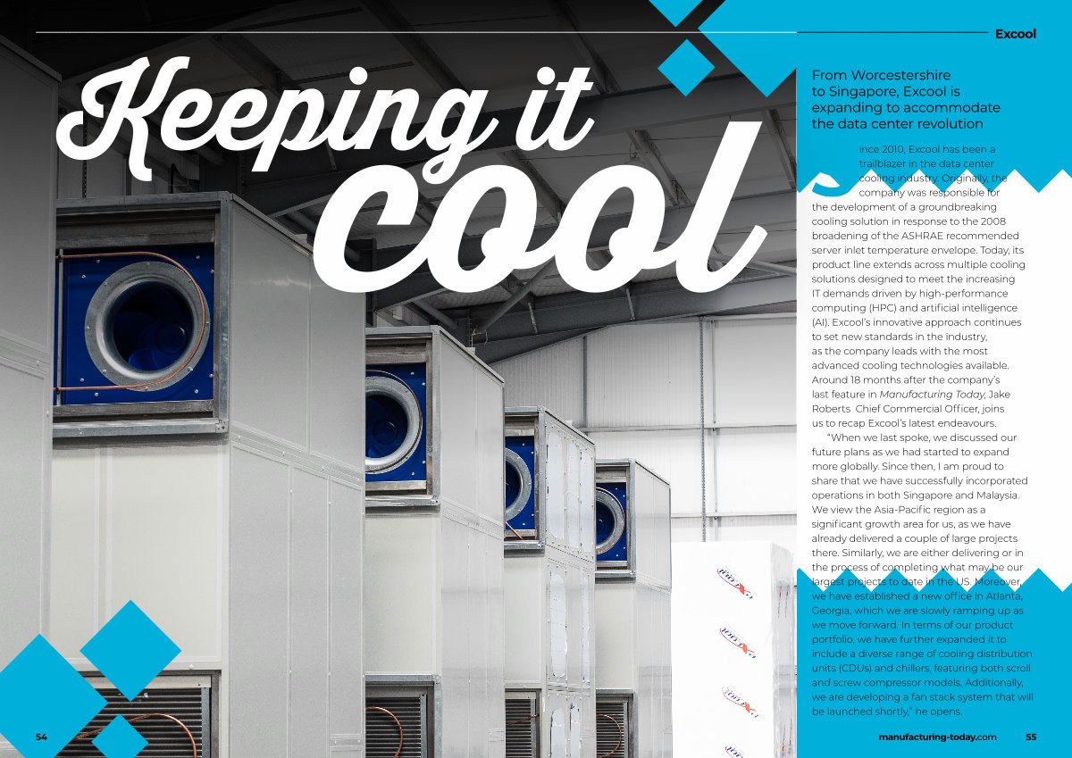 Since 2010, Excool has been a trailblazer in the data center cooling industry. Originally, the company was responsible for the development of a groundbreaking cooling solution in response to the 2008 broadening of the ASHRAE recommended server inlet temperature envelope. Today, its product line extends across multiple cooling solutions designed to meet the increasing IT demands driven by high-performance computing( HPC) and artificial intelligence( AI). Excool’ s innovative approach continues to set new standards in the industry, as the company leads with the most advanced cooling technologies available. Around 18 months after the company’ s last feature in Manufacturing Today, Jake Roberts Chief Commercial Officer, joins us to recap Excool’ s latest endeavours.