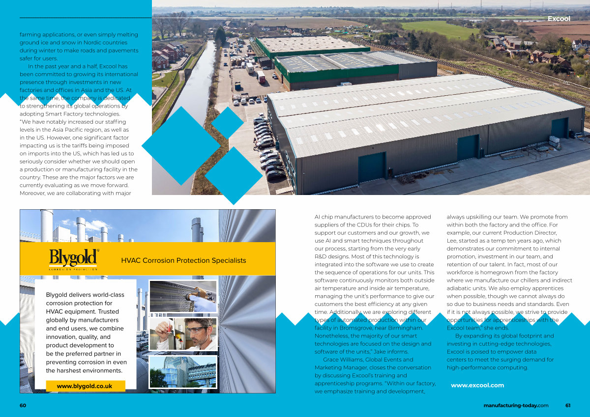AI chip manufacturers to become approved suppliers of the CDUs for their chips. To support our customers and our growth, we use AI and smart techniques throughout our process, starting from the very early R & D designs. Most of this technology is integrated into the software we use to create the sequence of operations for our units. This software continuously monitors both outside air temperature and inside air temperature, managing the unit’ s performance to give our customers the best efficiency at any given time. Additionally, we are exploring different types of automated production within our facility in Bromsgrove, near Birmingham. Nonetheless, the majority of our smart technologies are focused on the design and software of the units,” Jake informs.
