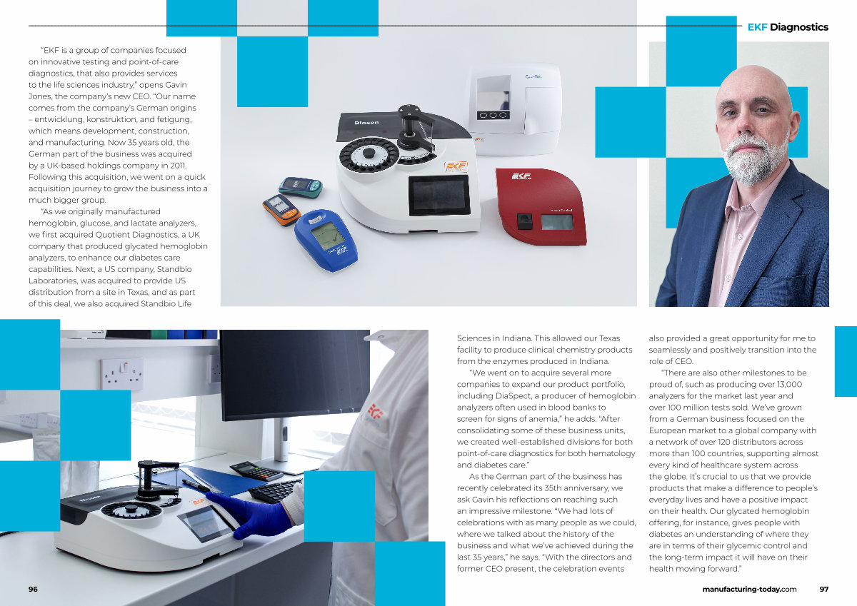 “ EKF is a group of companies focused on innovative testing and point-of-care diagnostics, that also provides services to the life sciences industry,” opens Gavin Jones, the company’ s new CEO.“ Our name comes from the company’ s German origins – entwicklung, konstruktion, and fetigung, which means development, construction, and manufacturing. Now 35 years old, the German part of the business was acquired by a UK-based holdings company in 2011. Following this acquisition, we went on a quick acquisition journey to grow the business into a much bigger group.
