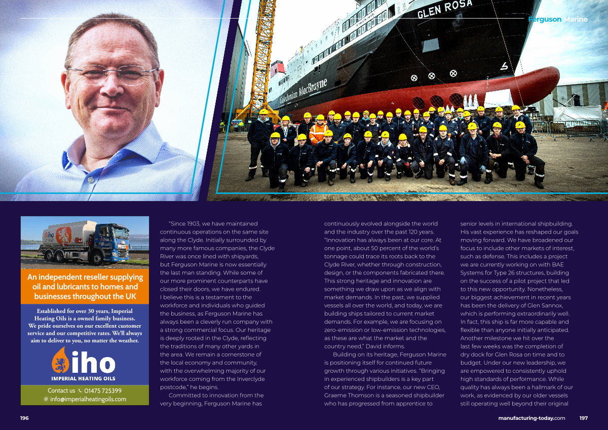 continuously evolved alongside the world and the industry over the past 120 years.“ Innovation has always been at our core. At one point, about 50 percent of the world’ s tonnage could trace its roots back to the Clyde River, whether through construction, design, or the components fabricated there. This strong heritage and innovation are something we draw upon as we align with market demands. In the past, we supplied vessels all over the world, and today, we are building ships tailored to current market demands. For example, we are focusing on zero-emission or low-emission technologies, as these are what the market and the country need,” David informs.
