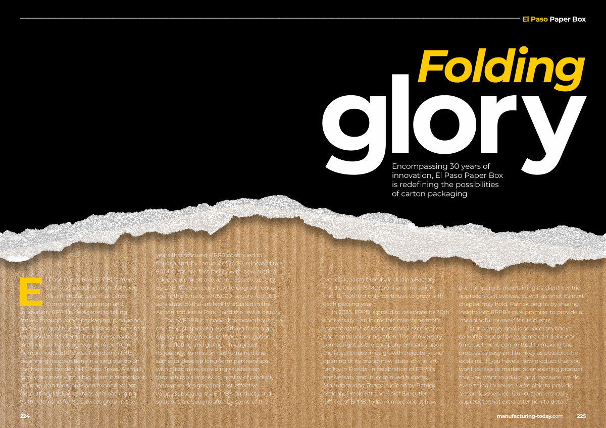 El Paso Paper Box( EPPB) is more than just a leading manufacturer: it’ s a manufacturer that cares. Combining imagination and innovation, EPPB is dedicated to telling stories through paper packaging, producing premium-quality, custom folding cartons that encapsulate its clients’ brand personalities in a vivid and exciting way. Formed from humble roots, EPPB was founded in 1995, beginning its operations in a single shop on the Mexican border in El Paso, Texas. A small family business with a big heart, it started out printing jean tags, but soon expanded into die cutting, folding cartons and packaging as the demand for its services grew. In the years that followed, EPPB continued to flourish and, by January of 2000, relocated to a 60,000-square-foot facility with new cuttingedge equipment and an increased capacity. By 2013, the company had to upgrade once again, this time to a 105,000-square-foot, 6.5- acre state-of-the-art facility situated in the Airport Industrial Park – and the rest is history.