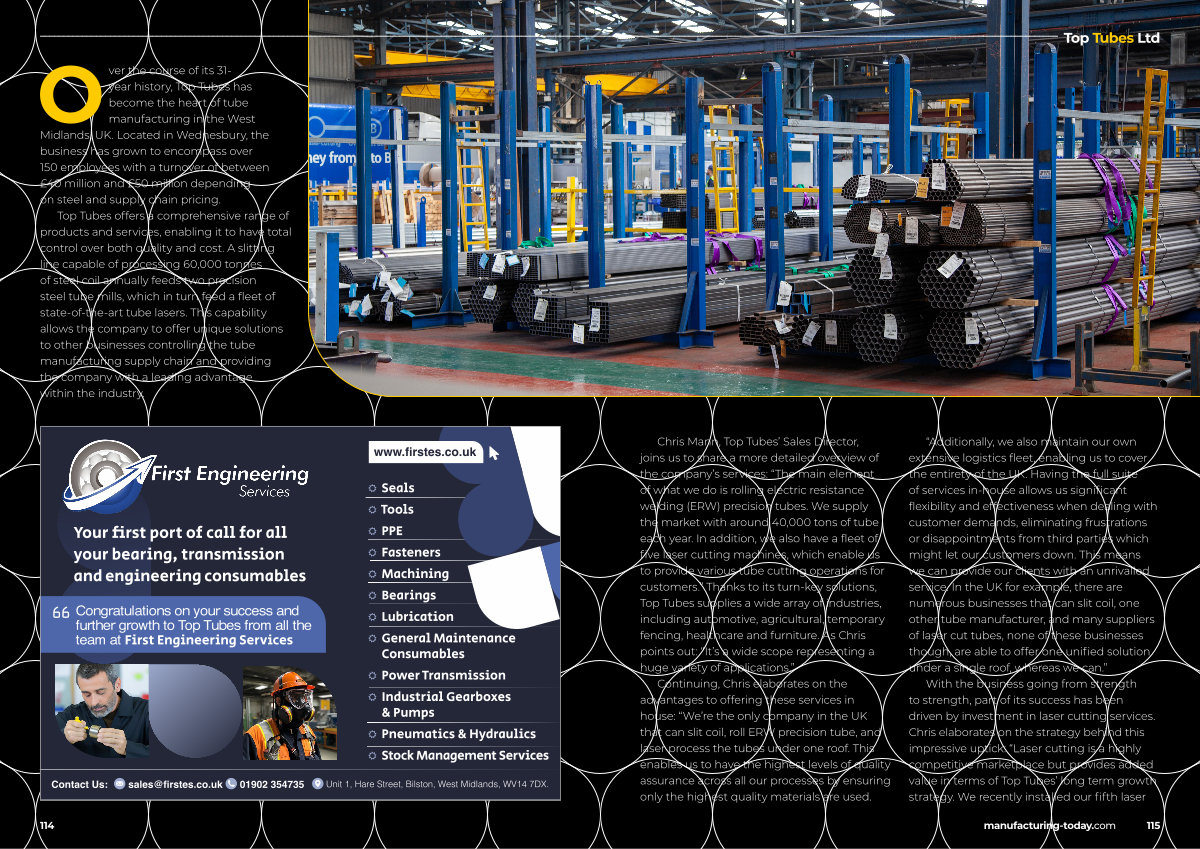 Chris Mann, Top Tubes’ Sales Director, joins us to share a more detailed overview of the company’ s services:“ The main element of what we do is rolling electric resistance welding( ERW) precision tubes. We supply the market with around 40,000 tons of tube each year. In addition, we also have a fleet of five laser cutting machines, which enable us to provide various tube cutting operations for customers.” Thanks to its turn-key solutions, Top Tubes supplies a wide array of industries, including automotive, agricultural, temporary fencing, healthcare and furniture. As Chris points out:“ It’ s a wide scope representing a huge variety of applications.”