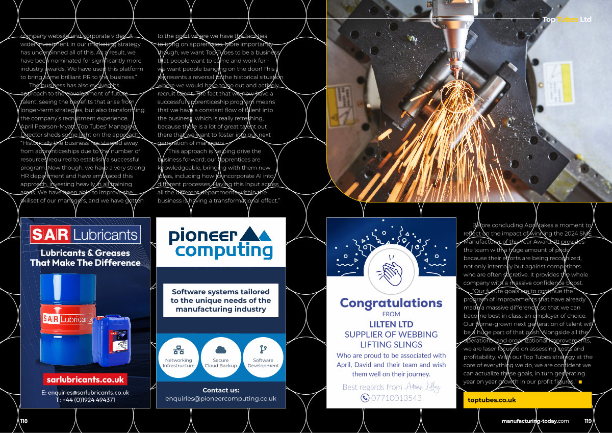 Before concluding April takes a moment to reflect on the impact of winning the 2024 SME Manufacturer of the Year Award:“ It provides the team with a huge amount of pride because their efforts are being recognized, not only internally but against competitors who are often secretive. It provides the whole company with a massive confidence boost.“ Our future goals are to continue the program of improvements that have already made a massive difference, so that we can become best in class, an employer of choice. Our home-grown next generation of talent will be a huge part of that push. Alongside all the operational and organizational improvements, we are laser focused on assessing costs and profitability. With our Top Tubes strategy at the core of everything we do, we are confident we can actualize these goals, in turn generating year on year growth in our profit figures.” ■