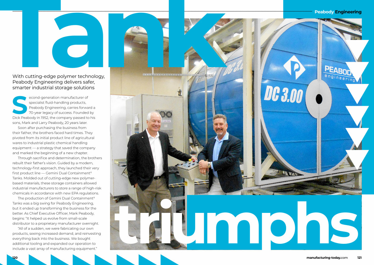 The production of Gemini Dual Containment ® Tanks was a big swing for Peabody Engineering, but it ended up transforming the business for the better. As Chief Executive Officer, Mark Peabody, begins:“ It helped us evolve from small-scale distributor to a proprietary manufacturer overnight.“ All of a sudden, we were fabricating our own products, seeing increased demand, and reinvesting everything back into the business. We bought additional tooling and expanded our operation to include a vast array of manufacturing equipment.” triu