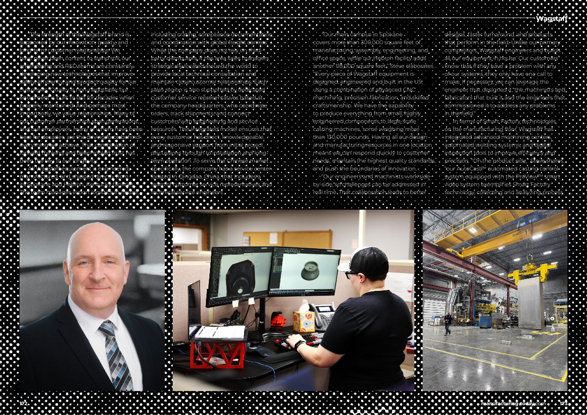“ Our engineers and machinists work sideby-side, so challenges can be addressed in real time. That collaboration leads to better designs, faster turnaround, and products that perform in the field. Unlike our primary competitors, Wagstaff engineers and builds all our equipment in house. Our customers know that if they have a problem with any of our systems, they only have one call to make. If necessary, we can leverage the engineer that designed it, the machinists and fabricators that built it and the engineers that commissioned it to address any problems in the field.”