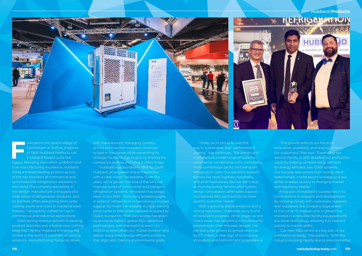 From strong revenue growth to exciting product launches and a brand-new, cuttingedge R & D facility, Hubbard is making big strides in the world of commercial cooling solutions. Manufacturing Today sat down with Ilias Katsoulis, Managing Director, to find out how the company continues to lead in innovation while expanding its strategic footprint. Ilias begins by sharing the company’ s journey and what it offers today.
