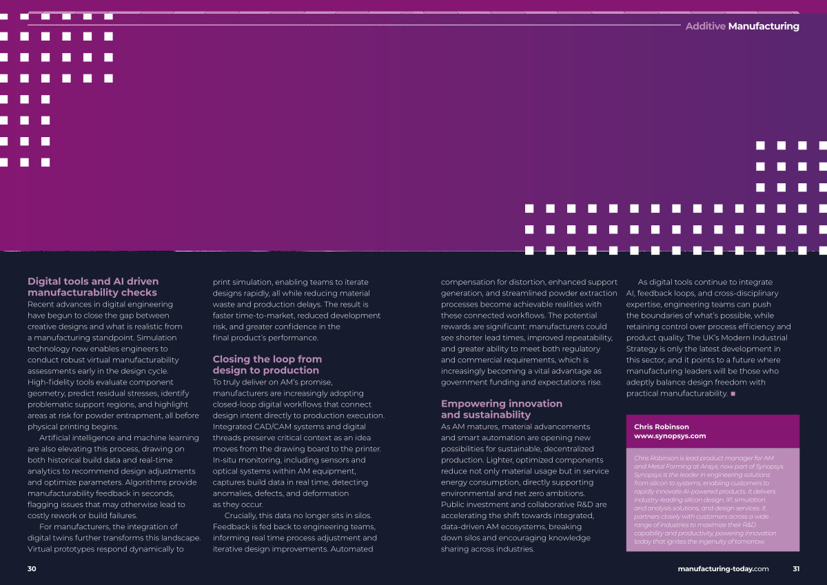 Recent advances in digital engineering have begun to close the gap between creative designs and what is realistic from a manufacturing standpoint. Simulation technology now enables engineers to conduct robust virtual manufacturability assessments early in the design cycle. High-fidelity tools evaluate component geometry, predict residual stresses, identify problematic support regions, and highlight areas at risk for powder entrapment, all before physical printing begins.