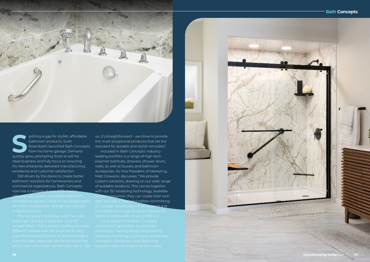 Spotting a gap for stylish, affordable bathroom products, Scott Rosenbach launched Bath Concepts from his home garage. Demand quickly grew, prompting Scott to sell his retail business and fully focus on ensuring his new enterprise delivered manufacturing excellence and customer satisfaction.