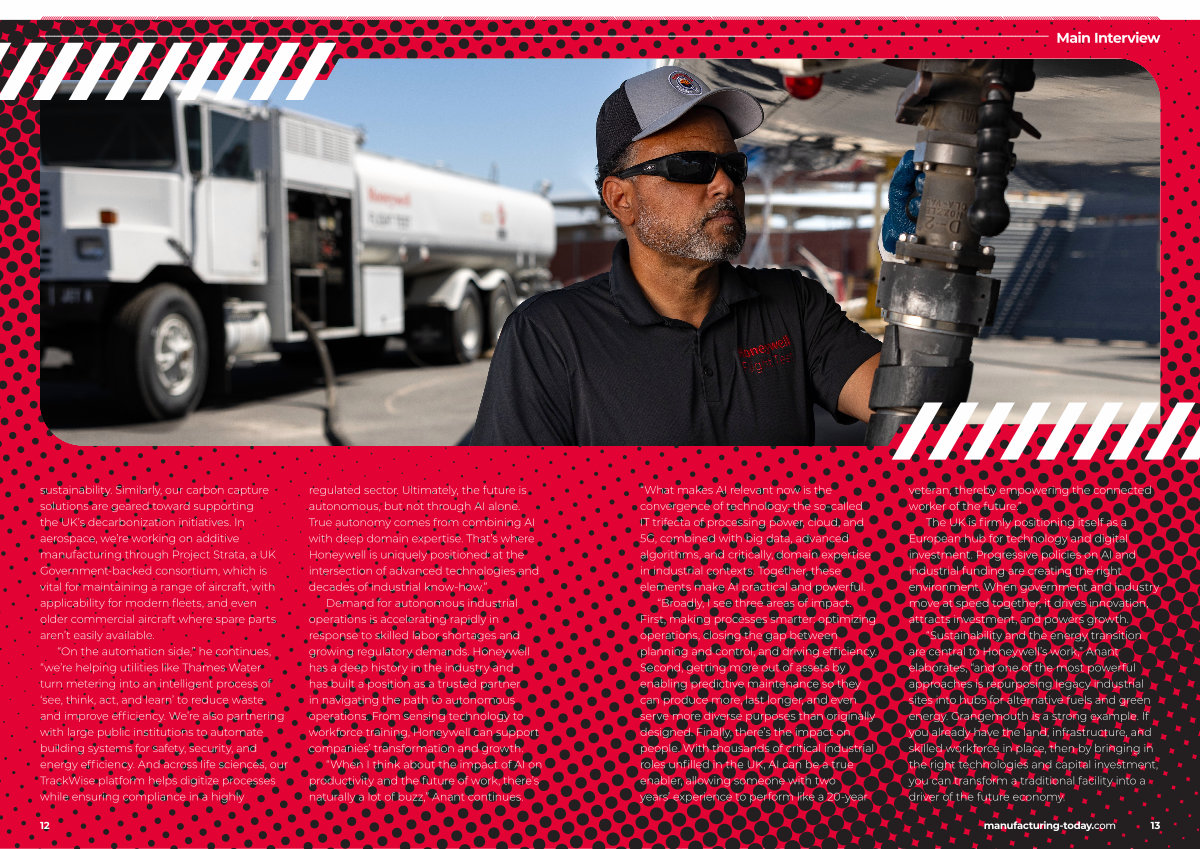 “ On the automation side,” he continues,“ we’ re helping utilities like Thames Water turn metering into an intelligent process of‘ see, think, act, and learn’ to reduce waste and improve efficiency. We’ re also partnering with large public institutions to automate building systems for safety, security, and energy efficiency. And across life sciences, our TrackWise platform helps digitize processes while ensuring compliance in a highly regulated sector. Ultimately, the future is autonomous, but not through AI alone. True autonomy comes from combining AI with deep domain expertise. That’ s where Honeywell is uniquely positioned: at the intersection of advanced technologies and decades of industrial know-how.”