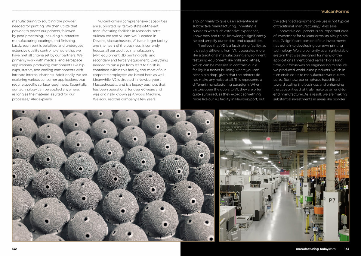 VulcanForms’ s comprehensive capabilities are supported by its two state-of-the-art manufacturing facilities in Massachusetts: VulcanOne and VulcanTwo.“ Located in Devens, Massachusetts, V1 is our larger facility and the heart of the business. It currently houses all our additive manufacturing( AM) equipment, 3D printing cells, and secondary and tertiary equipment. Everything needed to run a job from start to finish is contained within this facility, and most of our corporate employees are based here as well. Meanwhile, V2 is situated in Newburyport, Massachusetts, and is a legacy business that has been operational for over 60 years and was originally known as Arwood Machine. We acquired this company a few years