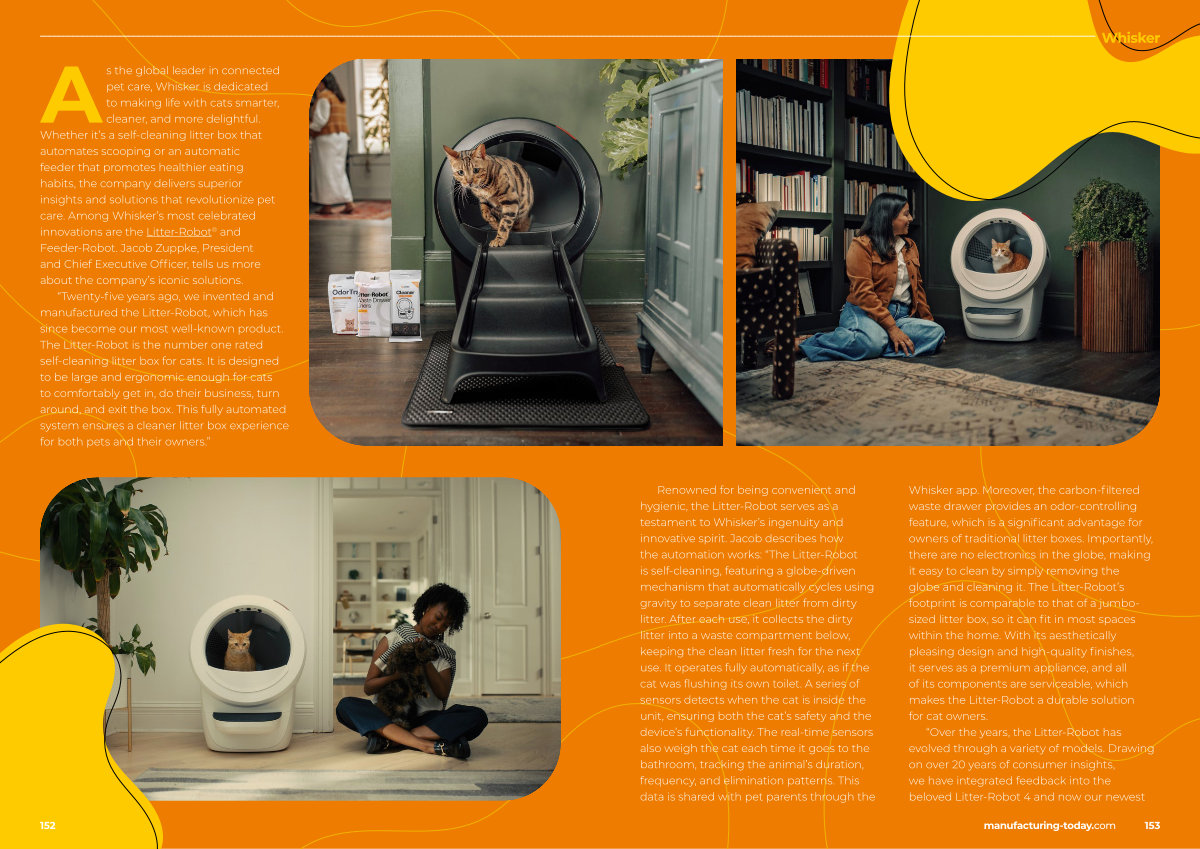 Renowned for being convenient and hygienic, the Litter-Robot serves as a testament to Whisker’ s ingenuity and innovative spirit. Jacob describes how the automation works:“ The Litter-Robot is self-cleaning, featuring a globe-driven mechanism that automatically cycles using gravity to separate clean litter from dirty litter. After each use, it collects the dirty litter into a waste compartment below, keeping the clean litter fresh for the next use. It operates fully automatically, as if the cat was flushing its own toilet. A series of sensors detects when the cat is inside the unit, ensuring both the cat’ s safety and the device’ s functionality. The real-time sensors also weigh the cat each time it goes to the bathroom, tracking the animal’ s duration, frequency, and elimination patterns. This data is shared with pet parents through the