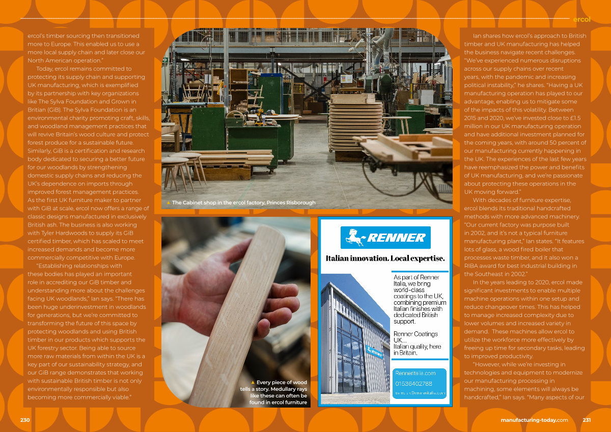 Ian shares how ercol’ s approach to British timber and UK manufacturing has helped the business navigate recent challenges.“ We’ ve experienced numerous disruptions across our supply chains over recent years, with the pandemic and increasing political instability,” he shares.“ Having a UK manufacturing operation has played to our advantage, enabling us to mitigate some of the impacts of this volatility. Between 2015 and 2020, we‘ ve invested close to £ 1.5 million in our UK manufacturing operation and have additional investment planned for the coming years, with around 50 percent of our manufacturing currently happening in the UK. The experiences of the last few years have reemphasized the power and benefits of UK manufacturing, and we’ re passionate about protecting these operations in the UK moving forward.”