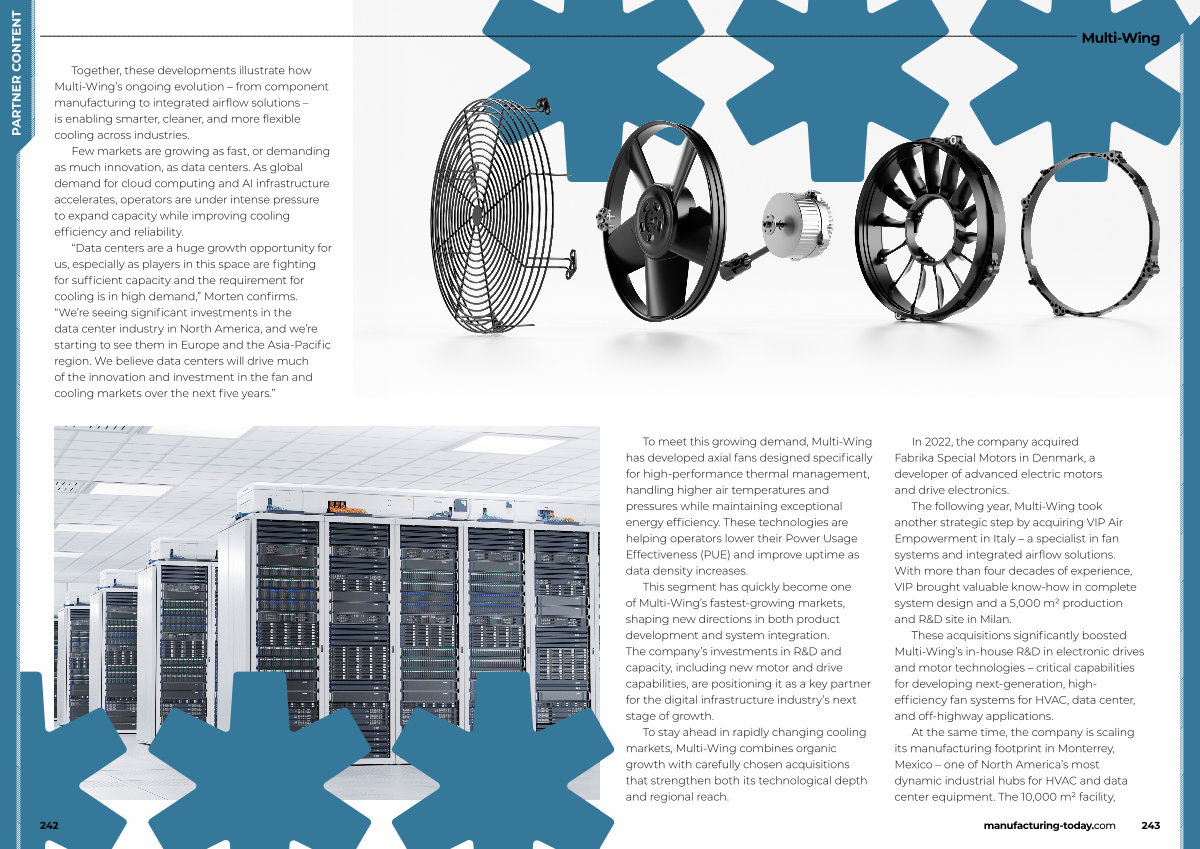 These acquisitions significantly boosted Multi-Wing’ s in-house R & D in electronic drives and motor technologies – critical capabilities for developing next-generation, highefficiency fan systems for HVAC, data center, and off-highway applications.