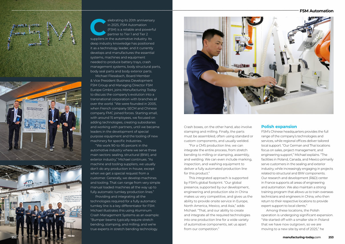 FSM’ s Chinese headquarters provides the full range of the company’ s technologies and services, while regional offices deliver tailored local support.“ Our German and Thai locations focus on sales, project management, and engineering support,” Michael explains.“ The facilities in Poland, Canada, and Mexico primarily serve customers in the sealing and exterior industry, while increasingly engaging in projects related to structural and BIW components. Our research and development( R & D) center in France supports all areas of engineering and automation. We also maintain a strong training program that allows us to train overseas technicians and engineers in China, who then return to their respective locations to provide expert support to local clients.”