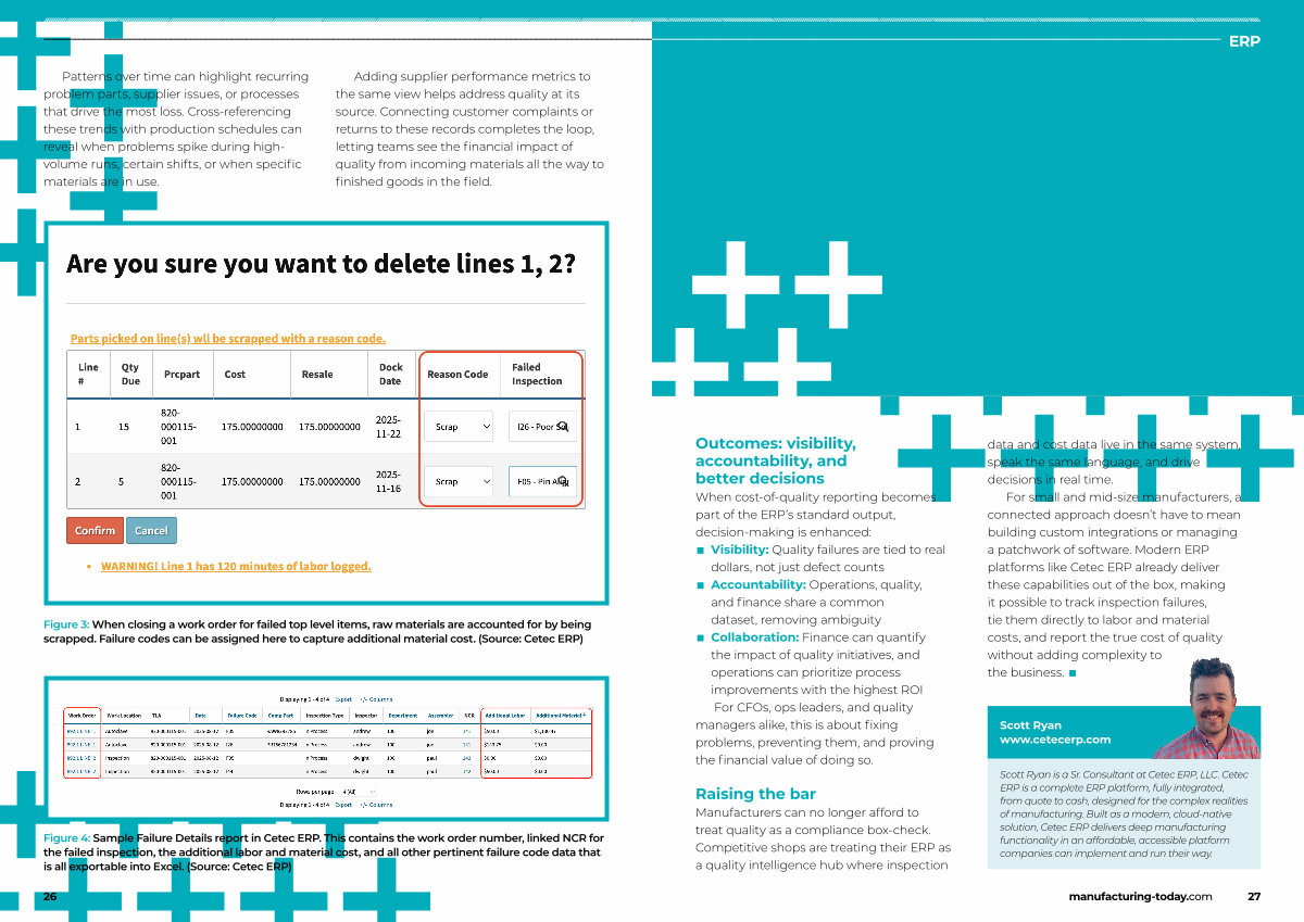 Figure 4: Sample Failure Details report in Cetec ERP. This contains the work order number, linked NCR for the failed inspection, the additional labor and material cost, and all other pertinent failure code data that is all exportable into Excel.( Source: Cetec ERP)