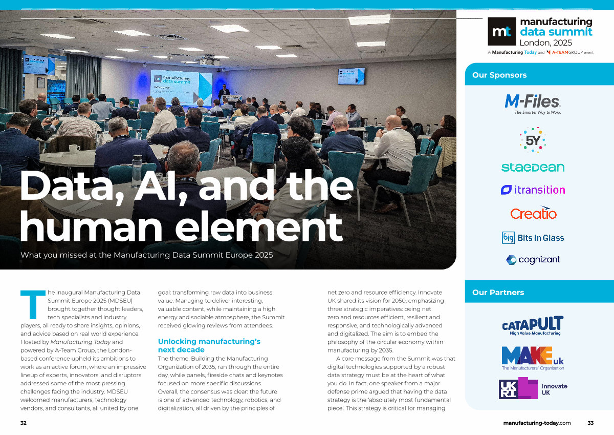 The inaugural Manufacturing Data Summit Europe 2025( MDSEU) brought together thought leaders, tech specialists and industry players, all ready to share insights, opinions, and advice based on real world experience. Hosted by Manufacturing Today and powered by A-Team Group, the Londonbased conference upheld its ambitions to work as an active forum, where an impressive lineup of experts, innovators, and disruptors addressed some of the most pressing challenges facing the industry. MDSEU welcomed manufacturers, technology vendors, and consultants, all united by one