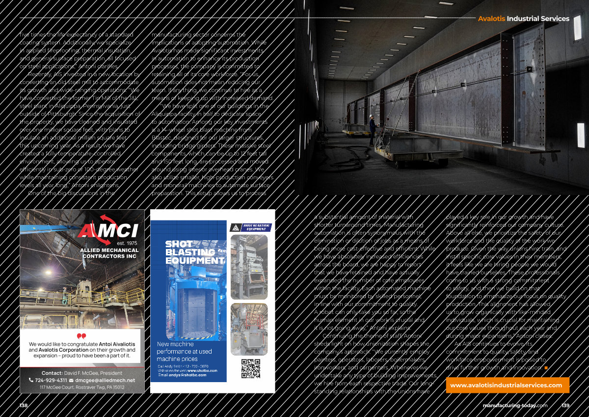 “ We have split one of our buildings in the Aliquippa facility in half to dedicate space to automation. Among our key investments is a 14-wheel shot blast machine from Blastec, designed for our larger structures, including bridge girders. These massive steel components, which can be up to 12 feet tall and 150 feet long, are processed and moved around using interior overhead cranes. We also utilize smaller, high-production conveyers and monorail machines to automate surface preparation. This setup allows us to process