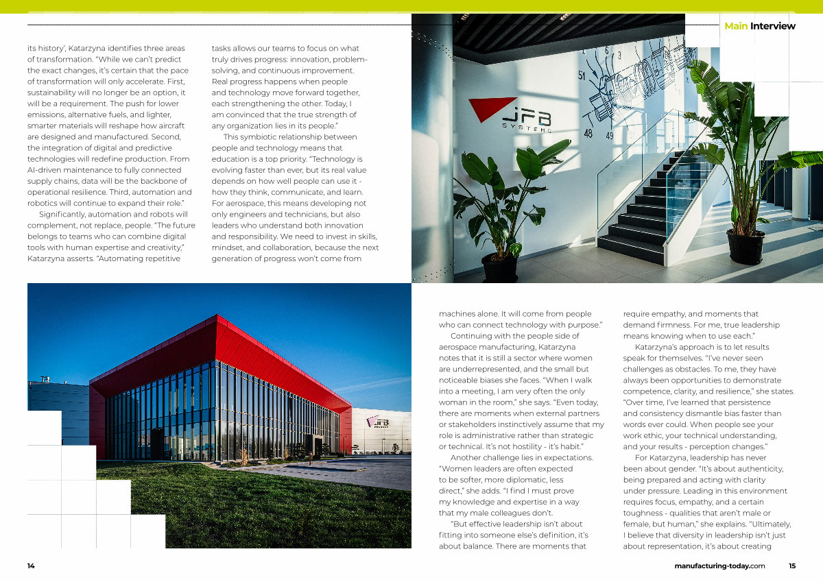 Continuing with the people side of aerospace manufacturing, Katarzyna notes that it is still a sector where women are underrepresented, and the small but noticeable biases she faces.“ When I walk into a meeting, I am very often the only woman in the room,” she says.“ Even today, there are moments when external partners or stakeholders instinctively assume that my role is administrative rather than strategic or technical. It’ s not hostility- it’ s habit.”