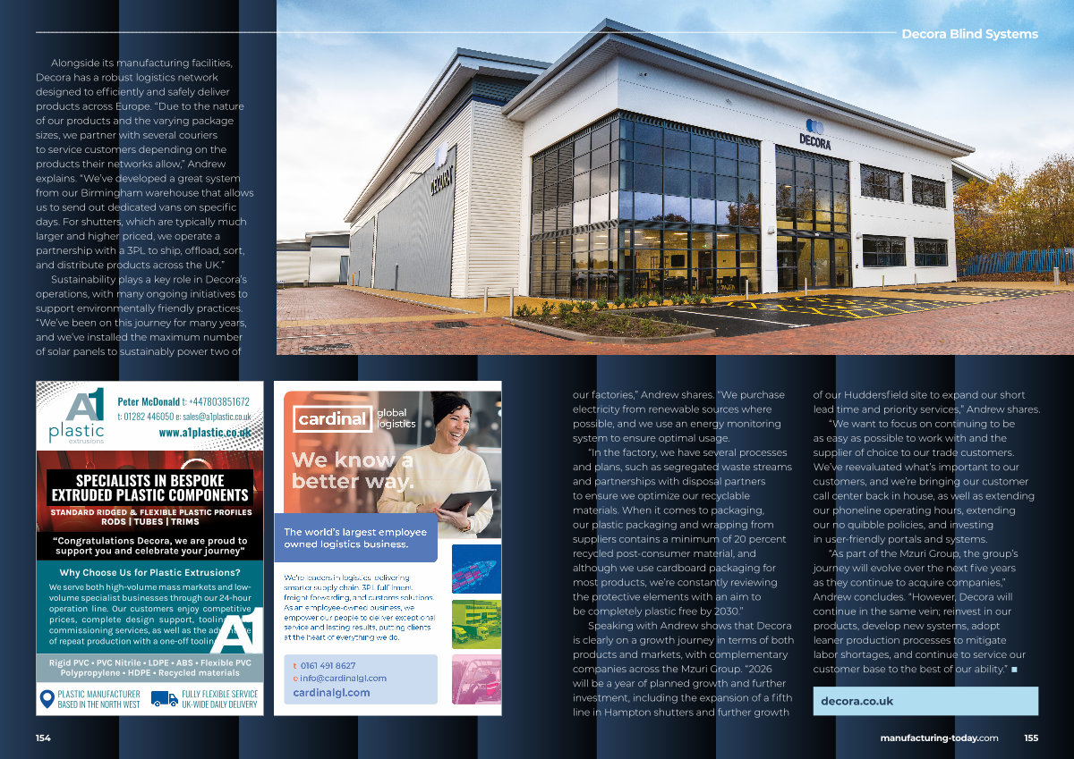 Alongside its manufacturing facilities, Decora has a robust logistics network designed to efficiently and safely deliver products across Europe.“ Due to the nature of our products and the varying package sizes, we partner with several couriers to service customers depending on the products their networks allow,” Andrew explains.“ We’ ve developed a great system from our Birmingham warehouse that allows us to send out dedicated vans on specific days. For shutters, which are typically much larger and higher priced, we operate a partnership with a 3PL to ship, offload, sort, and distribute products across the UK.”