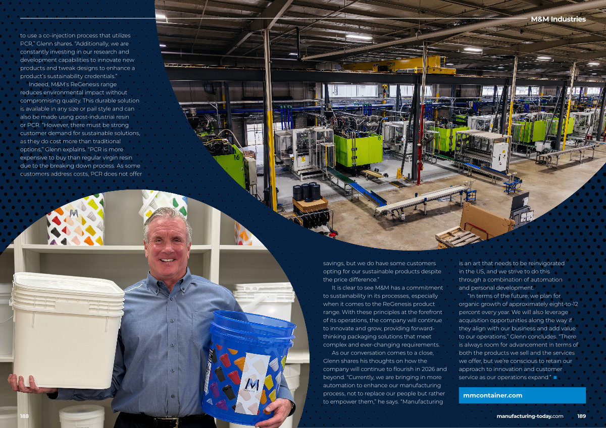 Indeed, M & M’ s ReGenesis range reduces environmental impact without compromising quality. This durable solution is available in any size or pail style and can also be made using post-industrial resin or PCR.“ However, there must be strong customer demand for sustainable solutions, as they do cost more than traditional options,” Glenn explains.“ PCR is more expensive to buy than regular virgin resin due to the breaking down process. As some customers address costs, PCR does not offer