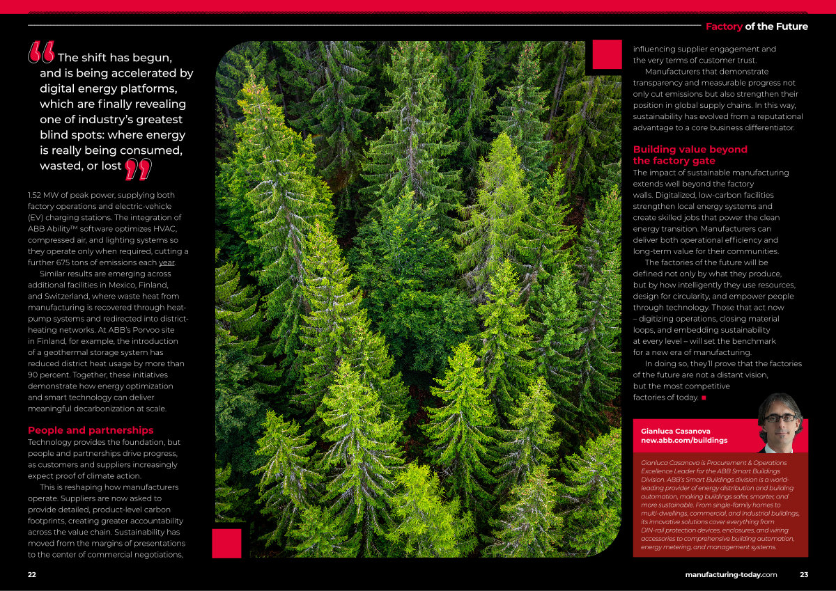 Similar results are emerging across additional facilities in Mexico, Finland, and Switzerland, where waste heat from manufacturing is recovered through heatpump systems and redirected into districtheating networks. At ABB’ s Porvoo site in Finland, for example, the introduction of a geothermal storage system has reduced district heat usage by more than 90 percent. Together, these initiatives demonstrate how energy optimization and smart technology can deliver meaningful decarbonization at scale.