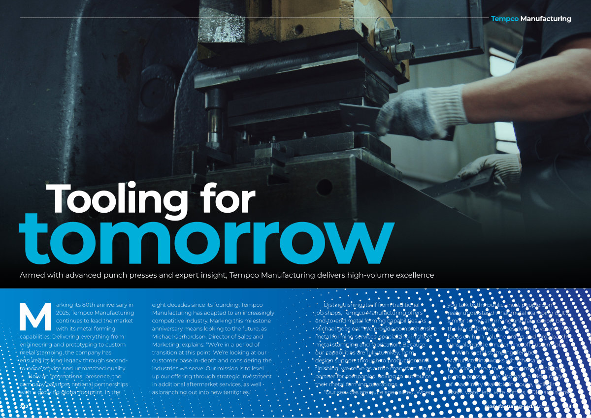 Marking its 80th anniversary in 2025, Tempco Manufacturing continues to lead the market with its metal forming capabilities. Delivering everything from engineering and prototyping to custom metal stamping, the company has ensured its long legacy through secondto-none service and unmatched quality. Now an international presence, the company balances national partnerships with a growing global footprint. In the eight decades since its founding, Tempco Manufacturing has adapted to an increasingly competitive industry. Marking this milestone anniversary means looking to the future, as Michael Gerhardson, Director of Sales and Marketing, explains:“ We’ re in a period of transition at this point. We’ re looking at our customer base in-depth and considering the industries we serve. Our mission is to level up our offering through strategic investment in additional aftermarket services, as well as branching out into new territories.”