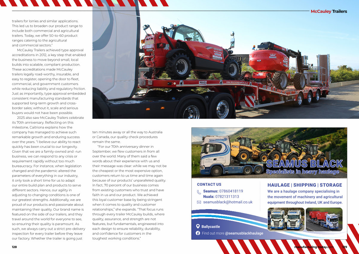 2025 also saw McCauley Trailers celebrate its 70th anniversary. Reflecting on this milestone, Caitriona explains how the company has managed to achieve such remarkable growth and enduring success over the years.“ I believe our ability to react quickly has been crucial to our longevity. Given that we are a family-owned and-run business, we can respond to any crisis or requirement rapidly without too much bureaucracy. For instance, when legislation changed and the pandemic altered the parameters of everything in our industry, it only took a short time for us to adapt our entire build plan and products to serve different sectors. Hence, our agility in adjusting to changing conditions is one of our greatest strengths. Additionally, we are proud of our products and passionate about maintaining their quality. Our brand name is featured on the side of our trailers, and they travel around the world for everyone to see, so ensuring their quality is paramount. As such, we always carry out a strict pre-delivery inspection for every trailer before they leave our factory. Whether the trailer is going just